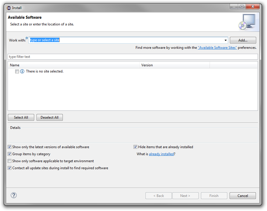 - Open Eclipse and select the Install New Software menu item under the Help menu.