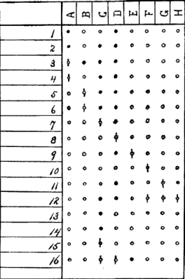 A, B, C, etc., are cards upon which are the names of students. 1, 2, 3, etc., are cards like the one described in the article. The small circles represent unassigned experiments. The black circles (slate nails) represent work done. The caudate circles (brass nail) represent work assigned.