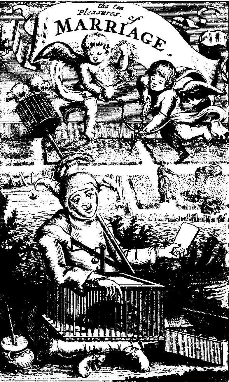 It is, in fact, as an example of English humour—exaggerated, no doubt, by the reaction from Puritanism—that The Ten Pleasures of Marriage should be viewed, in the main. It is true, however, that it is of uncertain parentage and must own to foreign kin. A well-known but (by a strange coincidence) almost equally rare book is Antoine de la Salle's Quinze Joies de Mariage. It seems possible that this was translated into English. At any rate, in the year in which The Ten Pleasures was published—1682-1683—the following work was registered at Stationers' Hall: The Woman's Advocate, or fifteen real comforts of matrimony, being in requital of the late fifteen sham comforts. Moreover, The Ten Pleasures was in all probability printed abroad—Hazlitt thinks at The Hague or Amsterdam. The very first page in the original edition contains one of several hints of Batavian production—"younger" is printed "jounger." The curious allusion to the great French poet, Clément Marot, may also suggest a temporary foreign sojourn for the author for though Marot was doubtless known to English readers in the seventeenth century, the exact reference of the allusion is not at all obvious. It very possibly reflects on the fact that in 1526 the Sorbonne condemned both Marot and his poem Colloque de l'abbé et de la femme sçavante; and Marot certainly wrote about women and marriage. He is not, however, a "stock" figure in English literary allusion, either learned or popular, and the fact suggests at least familiarity with the literature of other countries.