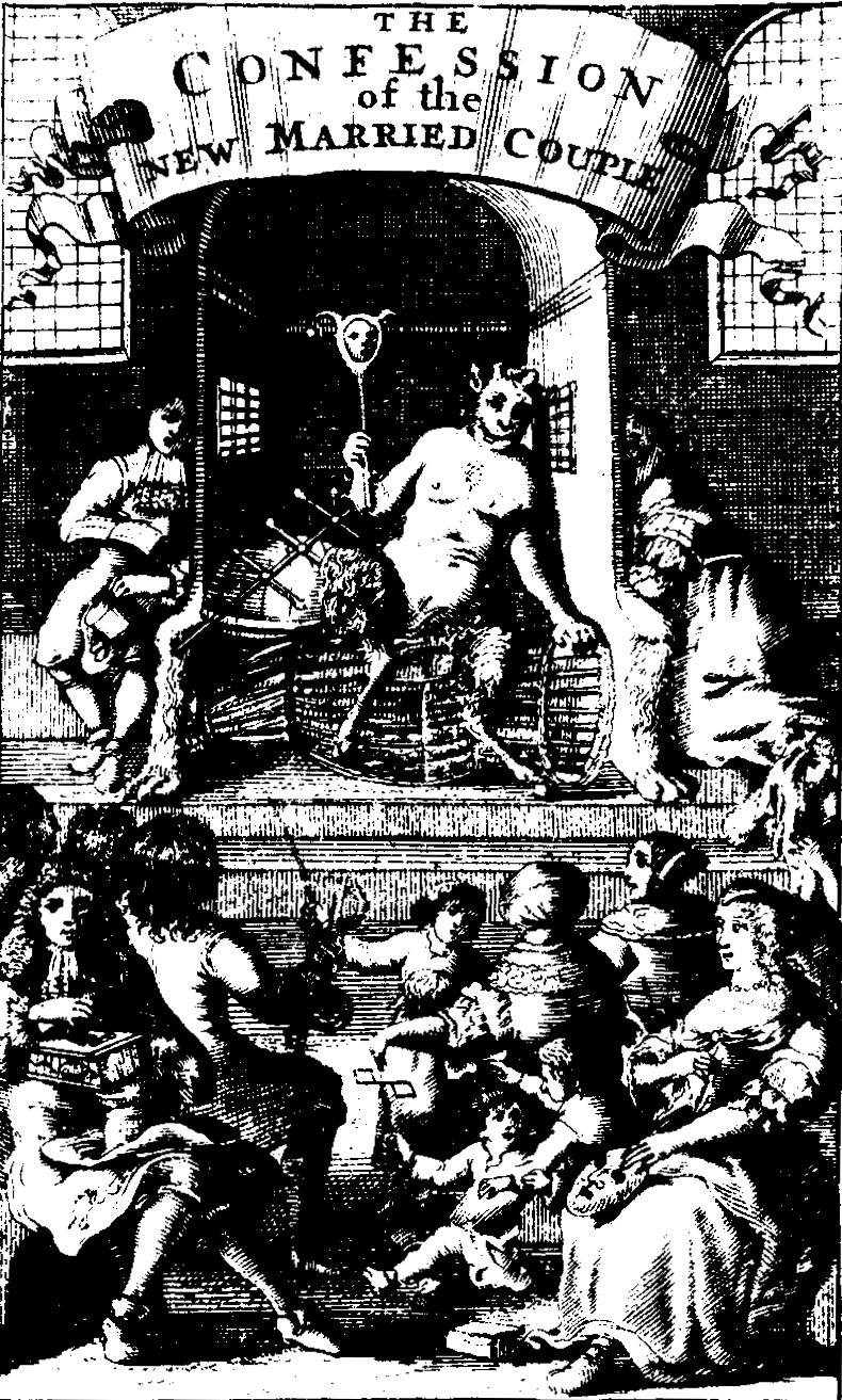 For that is the true point of this lively piece of irony (the irony is less well sustained in the sequel, The Confession of the New Married Couple, and dropped altogether in the bitter Letter at the end of The Ten Pleasures). It is a savage attack upon women—upon (to quote a Rabelaisian sentence) "the quarrelsome, crabbed, lavish, proud, opinionated, domineering and unbridled nature of the female sex." Women, he says, "are in effect of less value than old Iron, Boots and Shoes, etc., for we find both Merchants and money ready always to buy those commodities." The analogy is an unfortunate one, for one of his implications is that women can easily be bought. But he—if it is a "he"—is in deadly earnest. Love, marriage, he asks scornfully—what are they? A romance, are they? The true happiness of life? Very well: here are the pleasures of them. You will be in love and make a match—and look at all the worry of the settlement, in which, by the way, you may often be defrauded. You will get married—a fine ceremony, with a fine feast; and all the nasty old women of the neighbourhood will come and tell bawdy stories to enliven the occasion. You get married, and thereafter you are at the mercy of your wife, who will indulge your wishes or not as suits her mood. Your house will be all awry if she has but a slight headache. When the baby comes, the place will be filled with old women and baby-linen and medical apparatus, and you will have all the anxieties of a father added to the discomforts of a neglected husband. For the rest, your wife will know how "to cuckold, jilt, and sham" as well as any gay lady of Covent Garden. And so on.