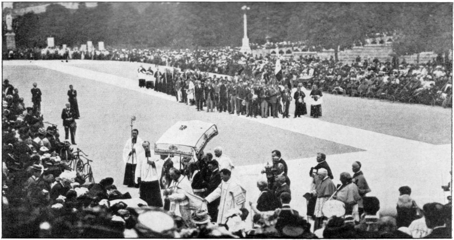 Presently from outside came the sound of organized singing, and the room began to empty. The afternoon procession was coming. I ran to the window that looks toward the Grotto; and there, sitting by an Assumptionist Father—one of that Order who once had, officially, charge of the Grotto, and now unofficially assists at it—I saw the procession go past.