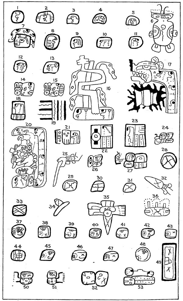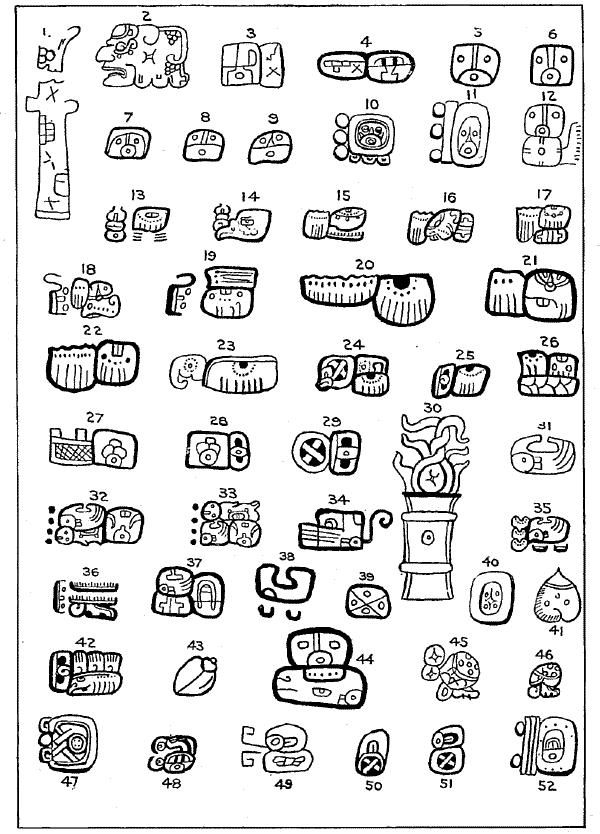 In a previous work205-1 I have expressed the opinion that the characters are to a certain extent phonetic—are not true alphabetic signs, but syllabic. And at the same time I expressed the opinion that even this definition did not hold true of all, as some were apparently ideographic, while others were simple abbreviated pictorial representations. In a subsequent paper205-2 I expressed substantially the same opinion, and gave as my belief that one reason why attempts at decipherment have failed of success is a misconception of the peculiar character of the writing, which peculiarity is found in the fact that, as it exists in the codices and inscriptions, it is in a transition stage from the purely ideographic to the phonetic. I stated also my belief that the writing had not reached the stage when each sound was indicated by a glyph or sign.[206]
