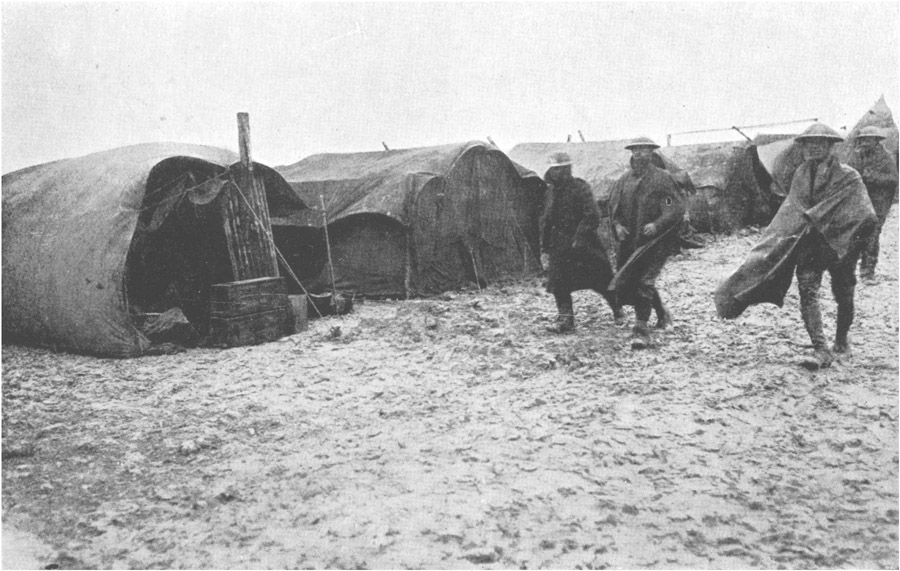 Cold high winds, saturated with moisture, accompanied the rain and searched one's very marrow. Nothing would exclude these sea breezes but skin or fur coats, and though accustomed to a severe climate, we Canadians felt the cold in England as we never had at home. Sometimes the temperature fell below the freezing point, and occasionally we had sleet, hail or snow for variety. Tents were often blown down by the hundreds, and it was a never-to-be-forgotten sight [13]watching a small army of soldiers trying to hold and pin down some of the large mess tents, while rope after rope snapped under the straining of the flapping canvas. One day the post office tent collapsed, and some of the mail disappeared into the heavens, never to return.