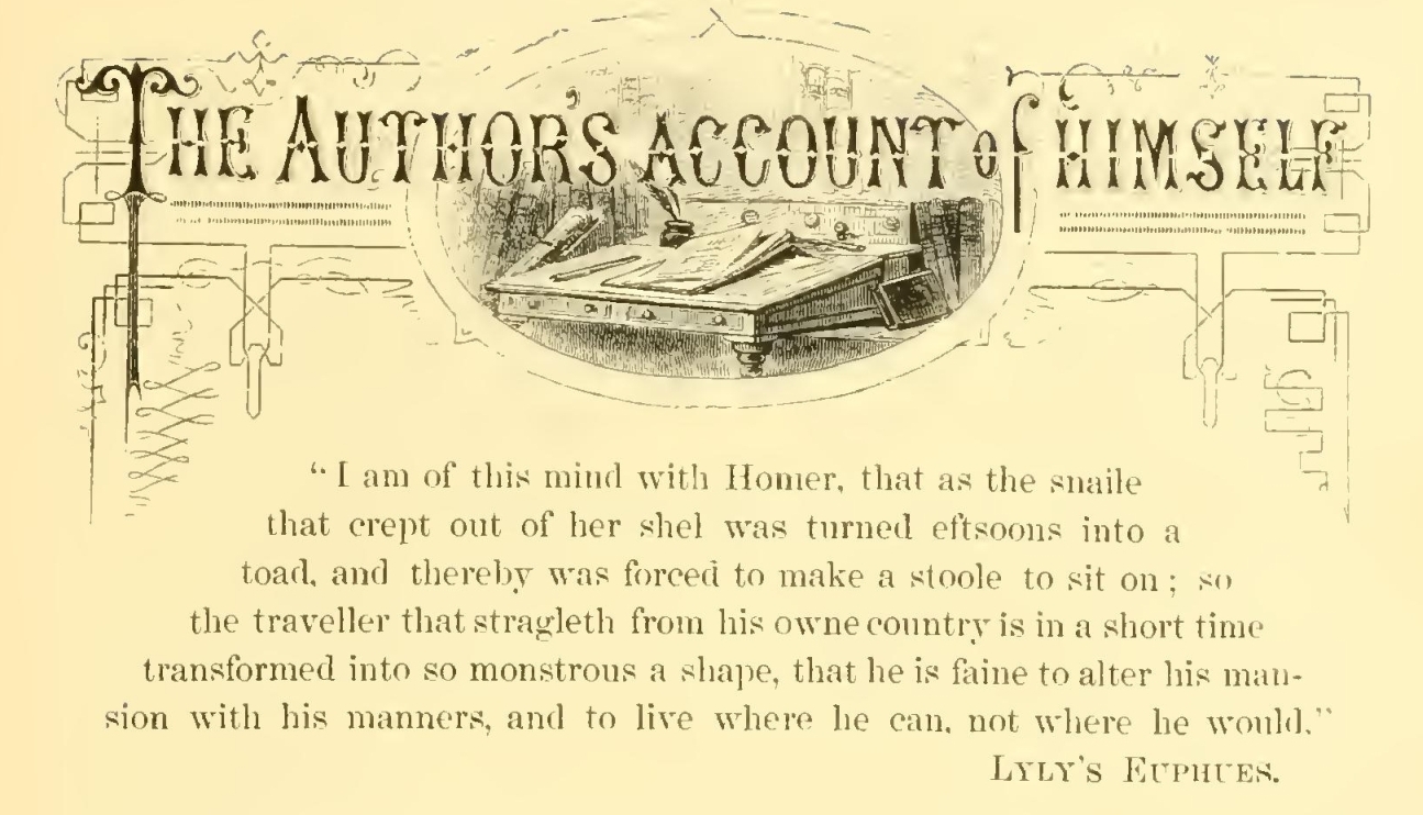 I am of this mind with Homer, that as the snaile that crept out of her shel was turned eftsoones into a toad I and thereby was forced to make a stoole to sit on; so the traveller that stragleth from his owne country is in a short time transformed into so monstrous a shape, that he is faine to alter his mansion with his manners, and to live where he can, not where he would.—LYLY’S EUPHUES.