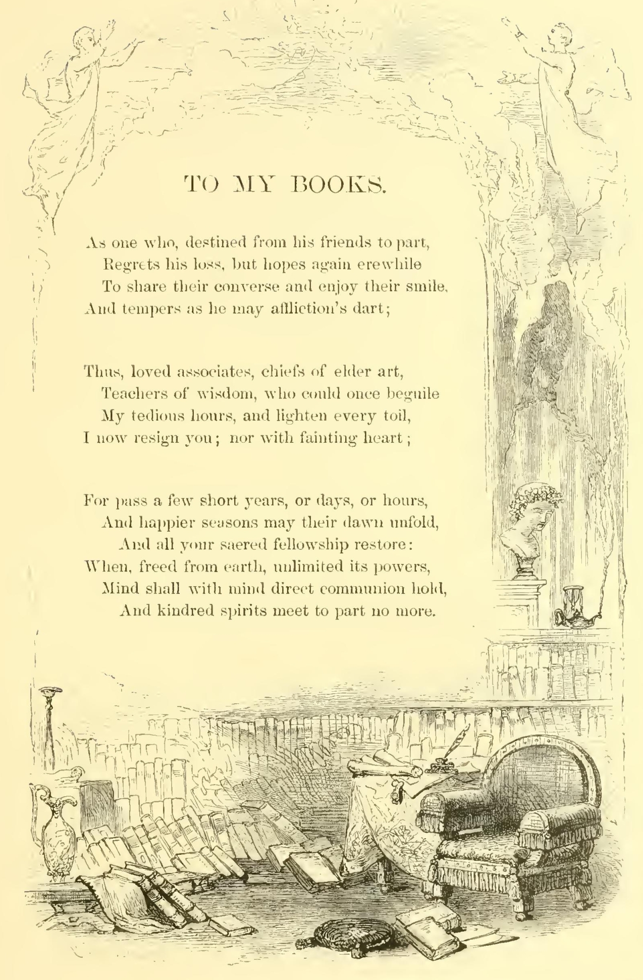 TO MY BOOKS. As one who, destined from his friends to part, Regrets his loss, but hopes again erewhile To share their converse and enjoy their smile, And tempers as he may affliction’s dart; Thus, loved associates, chiefs of elder art, Teachers of wisdom, who could once beguile My tedious hours, and lighten every toil, I now resign you; nor with fainting heart; For pass a few short years, or days, or hours, And happier seasons may their dawn unfold, And all your sacred fellowship restore: When, freed from earth, unlimited its powers. Mind shall with mind direct communion hold, And kindred spirits meet to part no more.