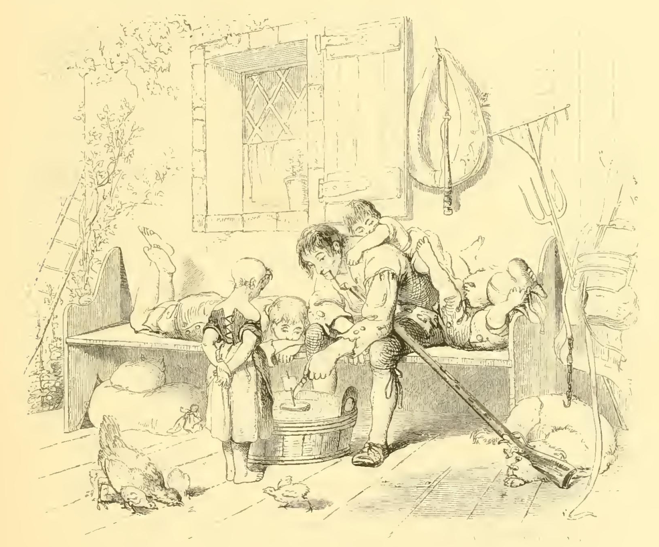 That all this might not be too onerous on the purses of his rustic patrons, who are apt to consider the costs of schooling a grievous burden and schoolmasters as mere drones, he had various ways of rendering himself both useful and agreeable. He assisted the farmers occasionally in the lighter labors of their farms, helped to make hay, mended the fences, took the horses to water, drove the cows from pasture, and cut wood for the winter fire. He laid aside, too, all the dominant dignity and absolute sway with which he lorded it in his little empire, the school, and became wonderfully gentle and ingratiating. He found favor in the eyes of the mothers by petting the children, particularly the youngest; and like the lion bold, which whilom so magnanimously the lamb did hold, he would sit with a child on one knee and rock a cradle with his foot for whole hours together.