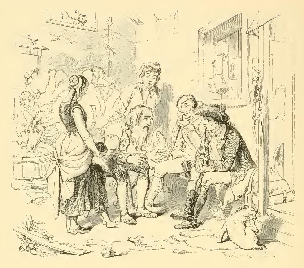 It was toward evening that Ichabod arrived at the castle of the Heer Van Tassel, which he found thronged with the pride and flower of the adjacent country—old farmers, a spare leathern-faced race, in homespun coats and breeches, blue stockings, huge shoes, and magnificent pewter buckles; their brisk withered little dames, in close crimped caps, long-waisted shortgowns, homespun petticoats, with scissors and pincushions and gay calico pockets hanging on the outside; buxom lasses, almost as antiquated as their mothers, excepting where a straw hat, a fine ribbon, or perhaps a white frock, gave symptoms of city innovation; the sons, in short square-skirted coats with rows of stupendous brass buttons, and their hair generally queued in the fashion of the times, especially if they could procure an eel-skin for the purpose, it being esteemed throughout the country as a potent nourisher and strengthener of the hair.