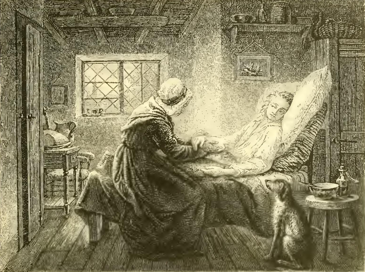 On parting with the old angler I inquired after his place of abode, and, happening to be in the neighborhood of the village a few evenings afterwards, I had the curiosity to seek him out. I found him living in a small cottage containing only one room, but a perfect curiosity in its method and arrangement. It was on the skirts of the village, on a green bank a little back from the road, with a small garden in front stocked with kitchen herbs and adorned with a few flowers. The whole front of the cottage was overrun with a honeysuckle. On the top was a ship for a weathercock. The interior was fitted up in a truly nautical style, his ideas of comfort and convenience having been acquired on the berth-deck of a man-of-war. A hammock was slung from the ceiling which in the daytime was lashed up so as to take but little room. From the centre of the chamber hung a model of a ship, of his own workmanship. Two or three chairs, a table, and a large sea-chest formed the principal movables. About the wall were stuck up naval ballads, such as “Admiral Hosier’s Ghost,” “All in the Downs,” and “Tom Bowling,” intermingled with pictures of sea-fights, among which the battle of Camperdown held a distinguished place. The mantelpiece was decorated with sea-shells, over which hung a quadrant, flanked by two wood-cuts of most bitter-looking naval commanders. His implements for angling were carefully disposed on nails and hooks about the room. On a shelf was arranged his library, containing a work on angling, much worn, a Bible covered with canvas, an odd volume or two of voyages, a nautical almanac, and a book of songs.