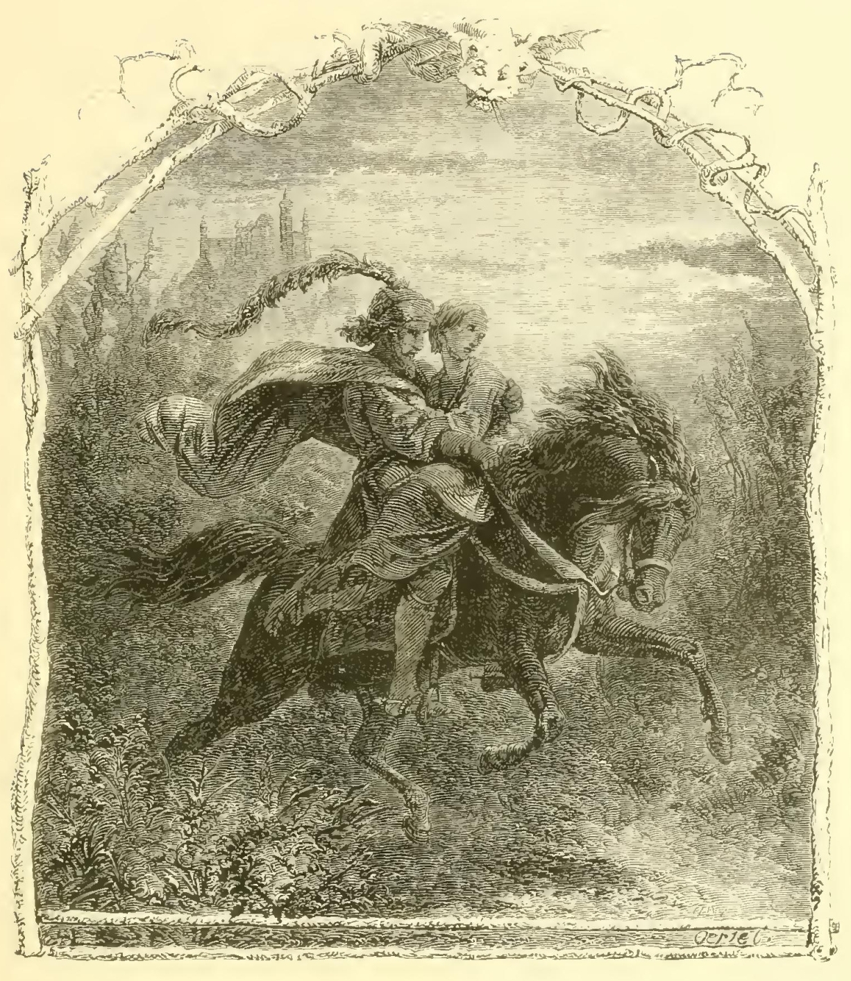 Ichabod, who had no relish for this strange midnight companion, and bethought himself of the adventure of Brom Bones with the Galloping Hessian, now quickened his steed in hopes of leaving him behind. The stranger, however, quickened his horse to an equal pace. Ichabod pulled up, and fell into a walk, thinking to lag behind; the other did the same. His heart began to sink within him; he endeavored to resume his psalm tune, but his parched tongue clove to the roof of his mouth and he could not utter a stave. There was something in the moody and dogged silence of this pertinacious companion that was mysterious and appalling. It was soon fearfully accounted for. On mounting a rising ground, which brought the figure of his fellow-traveller in relief against the sky, gigantic in height and muffled in a cloak, Ichabod was horror-struck on perceiving that he was headless! but his horror was still more increased on observing that the head, which should have rested on his shoulders, was carried before him on the pommel of the saddle. His terror rose to desperation, he rained a shower of kicks and blows upon Gunpowder, hoping by a sudden movement to give his companion the slip; but the spectre started full jump with him. Away, then, they dashed through thick and thin, stones flying and sparks flashing at every bound. Ichabod’s flimsy garments fluttered in the air as he stretched his long lank body away over his horse’s head in the eagerness of his flight.