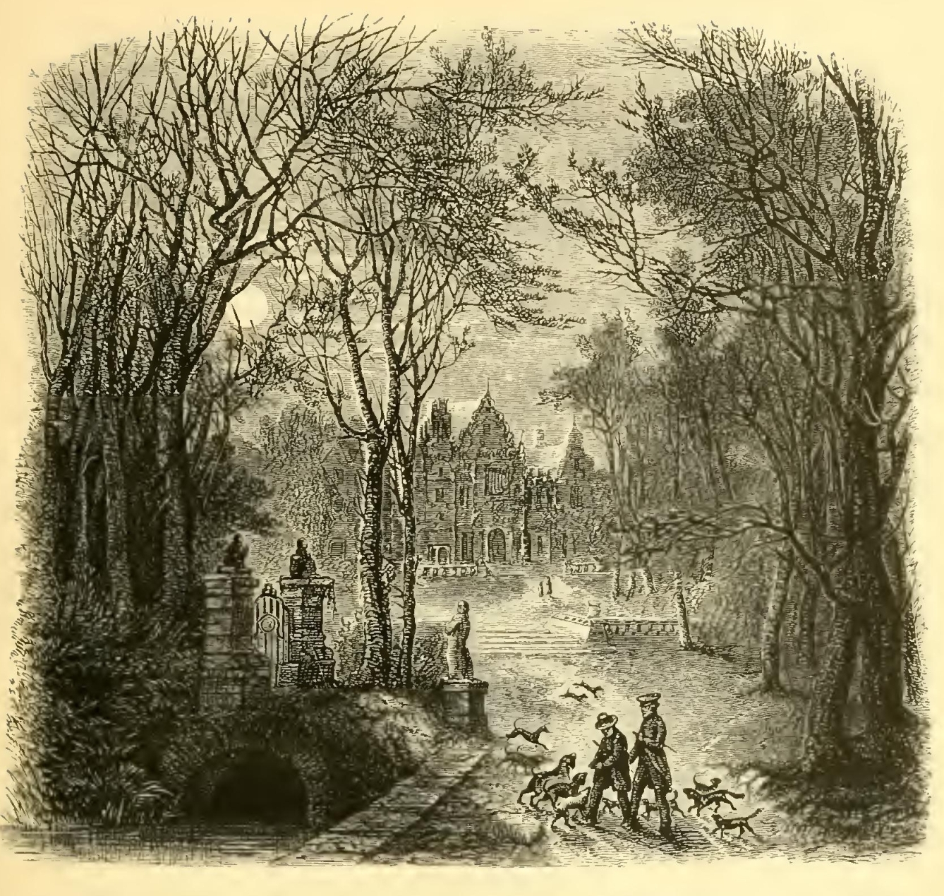 While my feelings were yet alive on the subject, it was my fortune to light on further traces of Mr. Roscoe. I was riding out with a gentleman, to view the environs of Liverpool, when he turned off, through a gate, into some ornamented grounds. After riding a short distance, we came to a spacious mansion of freestone, built in the Grecian style. It was not in the purest style, yet it had an air of elegance, and the situation was delightful. A fine lawn sloped away from it, studded with clumps of trees, so disposed as to break a soft fertile country into a variety of landscapes. The Mersey was seen winding a broad quiet sheet of water through an expanse of green meadow land, while the Welsh mountains, blended with clouds, and melting into distance, bordered the horizon.