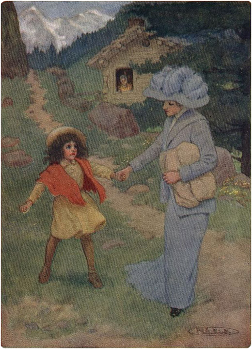 One bright sunny morning in June, a tall, vigorous maiden of the mountain region climbed up the narrow path, leading a little girl by the hand. The youngster's cheeks were in such a glow that it showed even through her sun-browned skin. Small [18]wonder though! for in spite of the heat, the little one, who was scarcely five years old, was bundled up as if she had to brave a bitter frost. Her shape was difficult to distinguish, for she wore two dresses, if not three, and around her shoulders a large red cotton shawl. With her feet encased in heavy hob-nailed boots, this hot and shapeless little person toiled up the mountain.