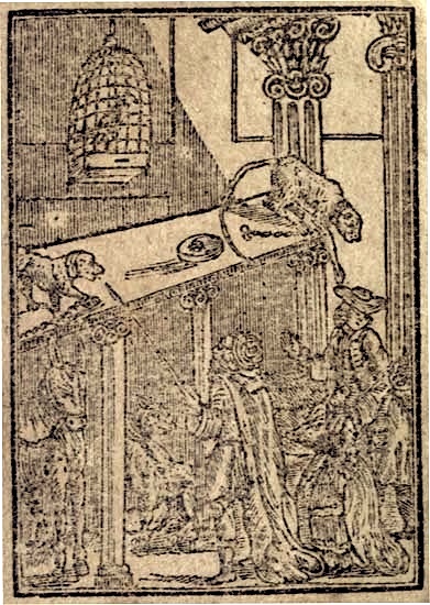 In one corner of the room where poor Tony Pig was confined, hung a large cage, which was the prison of a pert young magpie. As soon as my son Jacky who was the youngest of the company, and remarkably fond of birds, had saluted her by the well known appellation of mag, poor mag; she wagged her tail with surprising agility, and began to chatter in such an elevated tone, and with such a rapid pronunciation, that I was heartily glad when the kind Bramin commanded silence. "The body of this party coloured, loquacious bird, said he, is the involuntary residence of the late Miss Dorothy Chatterfast; who was a most notorious little gossip, and belonged to a family which is as numerous as that of the Greedyguts. To do her justice, she was a handsome little girl, and as brisk and notable as any young miss in her neighbourhood. But to her own misfortune, and the unspeakable vexation of most persons who came within the sphere of her observation, her little tongue was as active as her hands. She learned to talk very early, and so speedy was her improvement in the art of prattling, that, before she was three years old, she could lisp out a tale in very intelligible language. Her parents were so unwise as to encourage her in this mischievous kind of ingenuity, not only from the pleasure they took in hearing how fast she learned to speak, but because they considered it as an infallible token that she would, in time, prove an excellent wit and a notable manager. It is not, therefore, to be wondered at, that she took a great deal of notice of every thing which passed in the family, and particularly in the kitchen. If any of the servants accidentally broke a teacup, or saucer, a glass, &c. or received an unexpected visit from some of their acquaintance, or relations, when her parents happened to be absent from home; she never failed to inform them of it, the first opportunity, with many aggravating circumstances of her own invention; for which they generally complimented her, by way of reward, with the flattering titles of a good child, a sweet little dear, and a careful little girl. By this officious impertinence she frequently got the servants reprimanded, and sometimes dismissed; so that by degrees they all began to fear and hate her. She was equally attentive to every trifle which happened at the school, where she was daily sent to learn the art of reading, and the use of her needle; for the moment she came home, and before she had well entered the parlour door, and made her courtesy, her little tongue began to rattle like a mill clack."—"Mamma, said she, Tommy Careless was flogged for tearing his book, Jackey Two women, one standing and one seated Fidget because he was a naughty boy and would not sit still, Polly Giddybrains, for losing her needle and thread paper, and, Lord bless me! my ma'am was so cross, that she was going to put the nasty fool's cap on my head, only for miscalling the first word in my lesson."—"In short she was such a notorious telltale, that she was soon dignified by her school fellows with the honourable appellation of Dolly Cagmag. As she advanced in years, the habit grew upon her; and when she was old enough to be introduced into company, and go a visiting, she carried on the same mischievous and despicable trade abroad, in which she had met with such encouragement at home. Whatever she saw or heard in one place, she would be sure to report it in another; so that all the masters and misses who had the mortification to fall into her company, considered themselves as under the malicious inspection of a meddlesome spy; which they had the more reason to do, because she seldom failed to embellish her informations with the recital of several unfavourable circumstances of her own invention." "Indeed, Mr. Wiseman, said Betsey, my youngest daughter, what you have told us is exactly true; for I have been in company with Miss Chatterfast several times, and I remember once in particular that when Master Sprightly, who was a merry young spark, had stolen a kiss from Miss Patty Sweetlips, though the poor young lady blushed as red as scarlet, and seemed to be greatly displeased at the freedom which had been taken with her, Miss Chatterfast was so mischievous as to represent her to all her acquaintance as a bold little hussey, who loved to be kissed by the young gentlemen. When poor innocent Patty was informed of the character which had been so unjustly fixed upon her, she was ashamed to stir out of doors, and laid it so much to heart I thought she would have cried her eyes out." "This was very unkind indeed, replied the good Bramin; and yet, I sincerely believe that all the mischief her tongue was guilty of, was more owing to her vanity and that talkative humour in which she had always been encouraged from her infancy, than to any real malice in her heart. She had been long accustomed to speak without thinking, and naturally imagined that her impertinent loquacity would be as much admired and applauded by other people as by her thoughtless parents. I have the satisfaction, however, to observe that you are perfectly sensible of her mistake, though she had not the good fortune to be so herself. If she had lived much longer, it is very probable that the many slights and affronts she must necessarily have met with, would have opened her eyes: For those who by their impertinent censures set the whole world at defiance, may reasonably expect to find an enemy in every house they enter. But her meddlesome, inquisitive disposition proved to be the accidental means of shortening her days, before she had experience enough to correct it: for, one evening, Mr. Kindly, a wealthy merchant, indulged all the young masters and misses in the neighbourhood with a splendid ball at his own house: Miss Chatterfast, though she had at that time a severe cold upon her, was so desirous of embracing such a favourable opportunity of making her remarks upon the behaviour and different dresses of the company, and ther