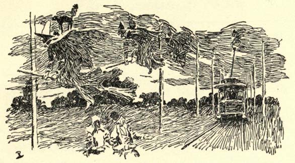 Drawing of a group of witches with their broomsticks flying over a streetcar