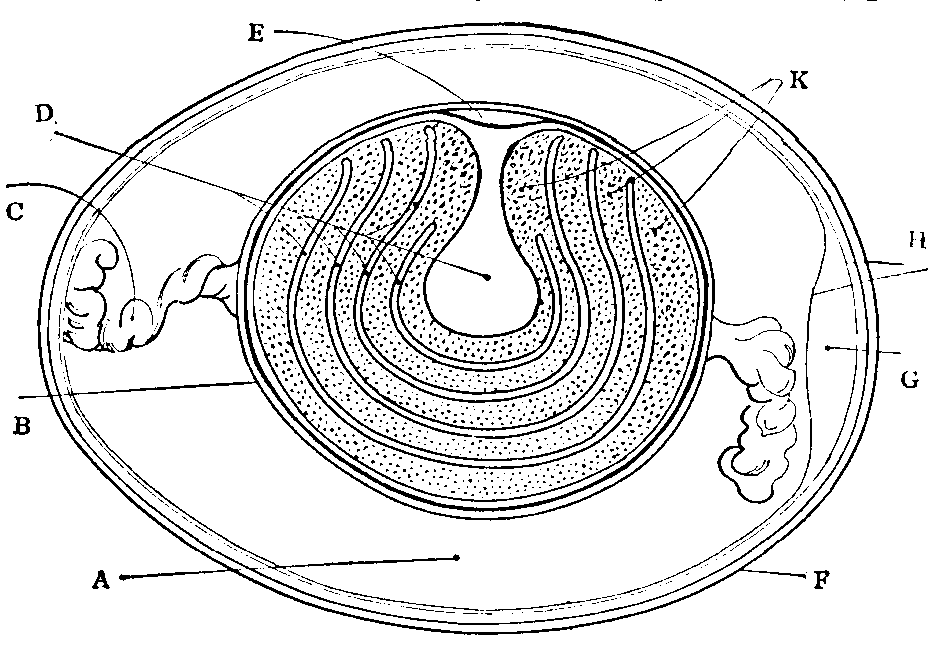 Echinus (e-kī´nus), Sea-urchin, or Sea-egg, a genus of marine animals, the type of an order (Echinoidea) of the phylum Echinodermata (see above). In this type the body is spheroidal and invested in a test or shell composed of regularly arranged plates closely united together. It is covered with movable spines articulated by ball-and-socket joints. The mouth is situated in the centre of the under surface, and there is a complicated masticatory apparatus (Aristotle's lantern) consisting of five chisel-ended teeth [150]supported by an elaborate framework. The anus is similarly placed on the upper side, and is surrounded by a circlet of ten plates (apical disc), one of which bears a furrowed tubercle (madreporite) perforated by small holes through which water enters the water-vascular system. Locomotion is effected by meridional rows of tube-feet, aided by the spines. E. esculentus and some other species are edible. See Sea-urchin.