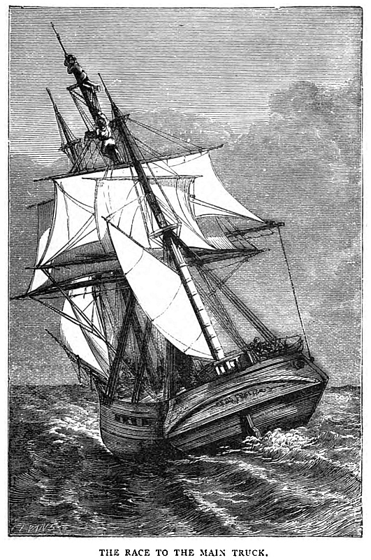 We were forward one evening, talking to the men, after they had knocked off work, the second mate having charge of the deck, the captain, first mate, and Andrew being below, when it was suggested that we two should try who could first reach the main truck. One was to start from the fore-top, the other from the mizen cross-trees. We were to come down on deck and then ascend the mainmast. We cast lots. It was decided that Ewen should start from the fore-top, I from the latter position. The second mate liked the fun, and did not interfere. We took up our positions, waiting for the signal—the wave of a boat-flag from the deck. The moment I saw it, without waiting to ascertain what Ewen was about, I began to run down the mizen shrouds; he in the meantime descended by the back stay and was already half up the main rigging on the port side before I had my feet on the ratlines on the starboard side. When once there I made good play, but he kept ahead of me and had already reached the royal-mast, swarming up it, before I had got on the cross-trees. As he gained the truck he shouted “Won! won!”