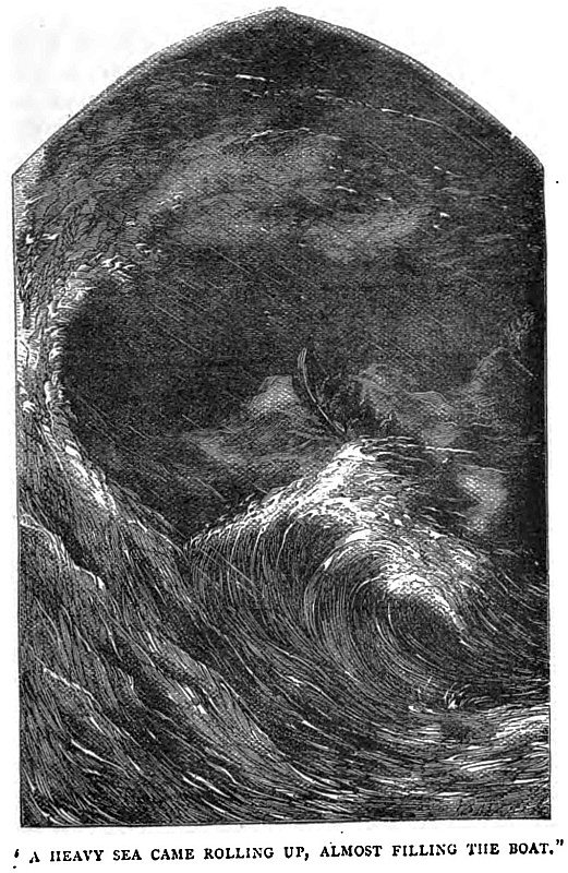 Already the sun had set. We had been a far longer time away than we had supposed. Night came down upon us. The boat’s compass feebly lighted by the lantern would, however, enable us to steer a proper course. We bent to our oars, but, unaccustomed to pull in so heavy a sea, I had great difficulty in keeping mine moving. Every instant it seemed as if we must be overwhelmed by the foaming billows which rolled up astern.