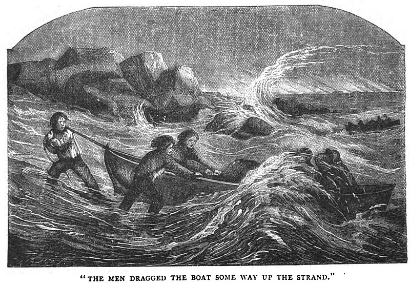 Although we could see the ship’s light, we could not be seen from her deck, and she might be standing away from us. Sandy anxiously watched the light, then altered our course more to the eastward, whereby the sea being brought on our beam rendered our condition even more dangerous than before. Sandy assured us, however, that we were getting nearer; and at last, believing that we might be heard, we all shouted together at the top of our voices, forgetting that the rattling of the blocks and dash of the sea against the sides of the ship would have rendered our cries inaudible. I had for long been pulling on mechanically, scarcely knowing what I was about, when I heard Sandy again shout out, “Heave lad, heave,” and looking round I saw the bowman standing up with a rope in his hand. It had been hove to him, but the end must have been slack. We had now to regain the ship which was flying from us, but could that be done, I asked myself.