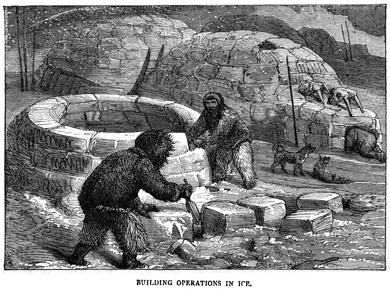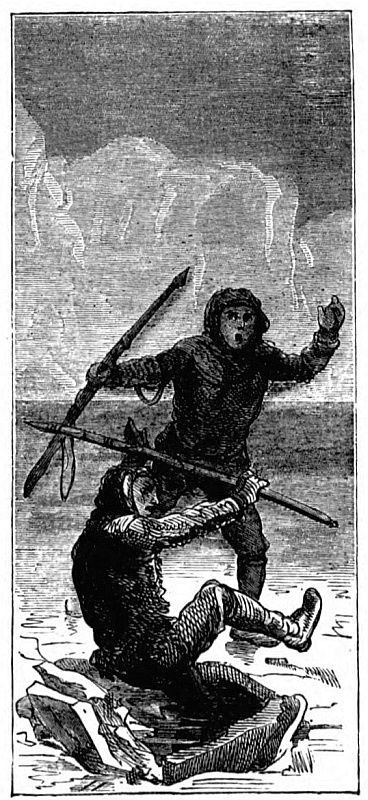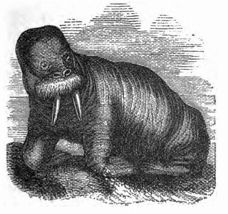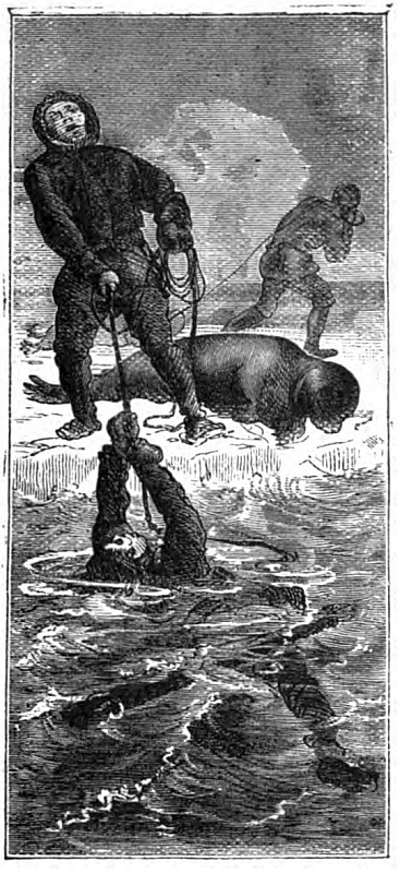 My brother fired and missed. The animal disappeared. We felt far from easy, for we knew that there was a great chance of its rising directly under the boat which it might too possibly capsize, or it might tear out a plank with its formidable tusks, when it would follow up the proceeding by attacking us as we struggled in the water. Happily, however, exhausted by the wounds it had received, it rose a short distance ahead, when a thrust from Andrew’s spear finished its career. We hauled it up on the ice by means of the tackles we carried for the purpose, to denude the huge body of the skin and blubber.