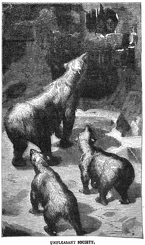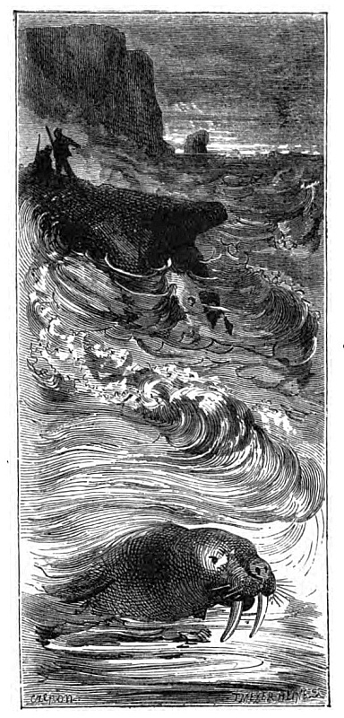 Besides these harpoons, we had four lances nine feet in length, to which the iron barbed heads were strongly fixed. As we were approaching the ice, we caught sight of two hundred black heads, at least, swimming rapidly along. They were morse, or walruses, and Andrew declared had got young with them who would retard their progress. Three boats were instantly lowered with their proper gear. I went with Sandy, who was an experienced walrus-hunter, and at once took the lead. We made the boat fly through the water, while ahead was the herd of walruses bellowing, snorting, blowing, and splashing. The herd kept close together, now diving, now reappearing simultaneously. One moment we saw their grizzly heads and long gleaming white tusks above the water, then they gave a spout and took a breath of fresh air, and the next moment their brown backs and huge flippers were to be seen and the whole herd were down. Sandy stood up in the bows with his harpoon ready for a dart. In a few seconds up again came the walruses, and we were in their midst. The harpoon flew from Sandy’s hand deep into the body of the nearest walrus. He then seized another harpoon and darted it into a “junger” which came swimming incautiously by. Its mother, hearing its plaintive cry, rushed towards us with her formidable tusks, endeavouring to recover it; but before she had time to dig them in the side of the boat a shot from one of our guns and a plunge from Sandy’s spear had terminated her existence. The “junger,” which was only slightly wounded, uttered a whimpering bark, when a score or more of walruses swam fiercely towards us, rearing their heads out of the water, snorting and blowing, ready to tear the boat to fragments. Several were killed before the calf had ceased its cries, when they prudently retired to a distance to escape our bullets and the thrusts from our spears. We had secured six walruses; for, though others were wounded they sank.