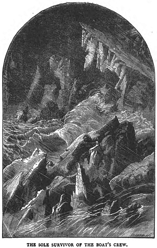 Night came on, and shortly afterwards the snow began to fall thickly, covering our deck, while from one side of the heavens the full moon burst forth from amid the clouds, lighting up the scene, increasing rather than diminishing its horrors. The snow circled in thick eddies round us, the sea foamed and raged, and masses of ice in the wildest motion were swept by; the timbers strained and creaked, while the ship shook under the reiterated shocks, sufficient it seemed to rend her into fragments, but the ice which had collected round her prevented her destruction.