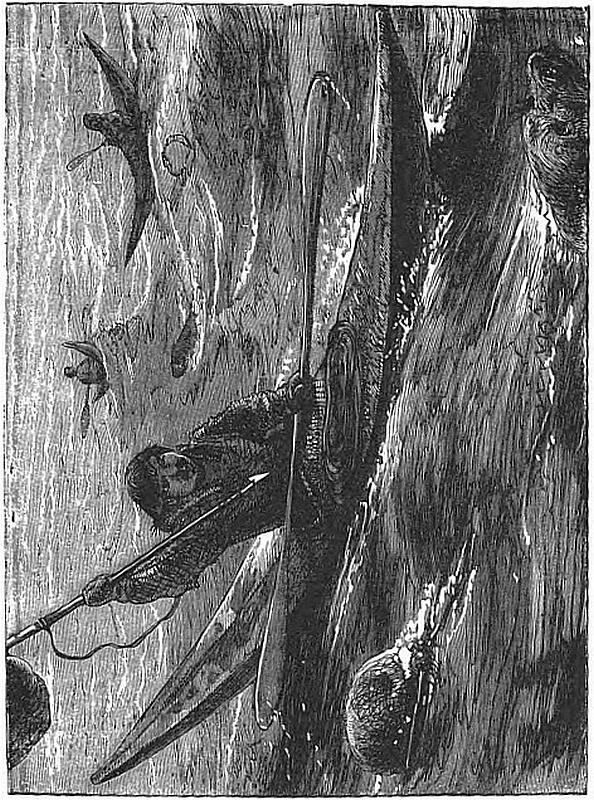As I swam away I looked round with a horrible dread of seeing the whale open-mouthed following me; but, instead, I caught sight of its flukes raised high in the air, and down it dived, carrying out the line still fast.