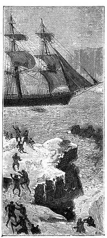 When I awoke a change had come over the scene. I went on deck, a perfect calm prevailed. All round us were piles of ice. The blocks and masses which stood out against the sky were cast into shades, while the level floes sparkled like silver in the rising sun. Far away to the southward we could still see the ocean heaving slowly. In a short time, however, leads between the bergs and floes opened out, the water being of the colour of lead. All hands were called up to make sail, and we stood on forcing our way between the floes, until open water was reached, though in every direction lofty icebergs and extensive floes were still to be seen. Many of the bergs were of the most fantastic form and brilliant colours. Some had arches of vast size, others caverns worn in them within which the ice appeared of the brightest blue and green, curtained with glittering icicles, all without being of stainless white.