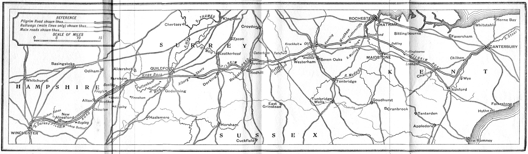 The modern road from Charing to Canterbury 263 cuts off this corner, and saves a good two miles or three, but the reasons which caused men in the original condition of the country to take the longer course of the Old Road are not far to seek.