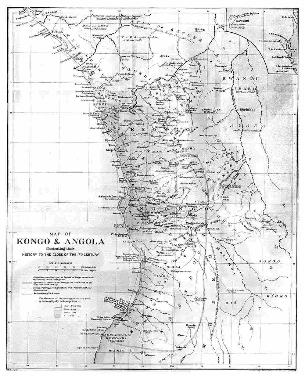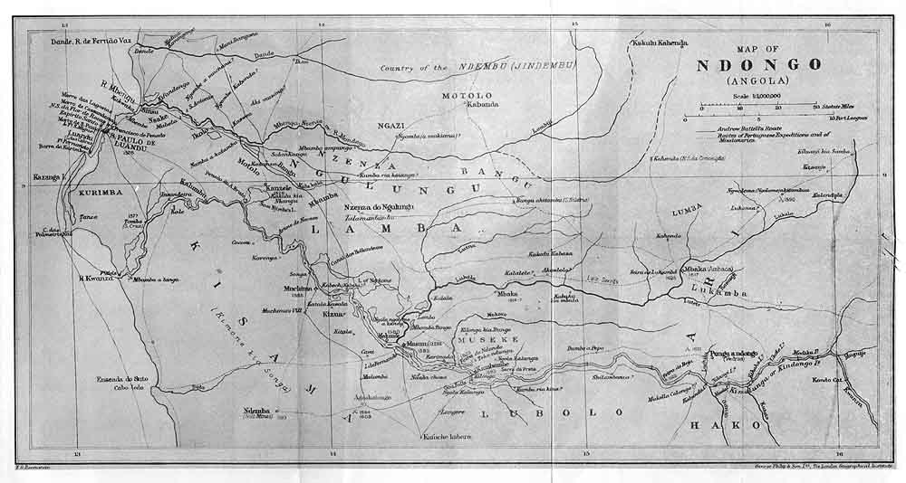 In collecting materials for the maps and for the notes illustrating Battell’s narrative, I felt bound to consult all accessible literary sources dealing with the history and geography of Kongo and Angola. Whilst ploughing my way through this mass of material, it struck me that a concise history of these African countries, from the time of their discovery to the end of the seventeenth century, might form an acceptable appendix to Battell’s Adventures, and at the same time increase the bulk of the volume dedicated to him to more respectable proportions. Much material of use for such a purpose has seen the light since the publication of J. J. Lopes de Lima’s historical sketches. Yet I am bound to confess that the result of all this tedious labour is disappointing. I may have been able to rectify a few dates and facts; but much remains to be done before we can claim to be in possession of a trustworthy history of that part of Africa. Possibly my little sketch may rouse a Portuguese into taking up the work of the late Luciano Cordeiro. Many documents not yet published should be discoverable in the archives of Portugal, Spain, and Luandu.8