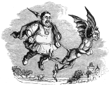 ABOUT twelve o’clock, just as the bell of the packet is tolling a farewell to London Bridge, and warning off the blackguard-boys with the newspapers, who have been shoving Times, Herald, Penny Paul-Pry, Penny Satirist, Flare-up, and other abominations into your face—just as the bell has tolled, and the Jews, strangers, people-taking-leave-of-their-families, and blackguard-boys aforesaid are making a rush for the narrow plank which conducts from the paddle-box of the Emerald steamboat unto the quay—you perceive, staggering down Thames Street, those two hackney-coaches, for the arrival of which you have been praying, trembling, hoping, despairing, swearing—sw——, I beg your pardon, I believe the word is not used in polite company—and transpiring, for the last half-hour. Yes, at last, the two coaches draw near, and from thence an awful number of trunks, children, carpet-bags, nurserymaids, hat-boxes, band-boxes, bonnet-boxes, desks, cloaks, and an affectionate wife, are discharged on the quay.
