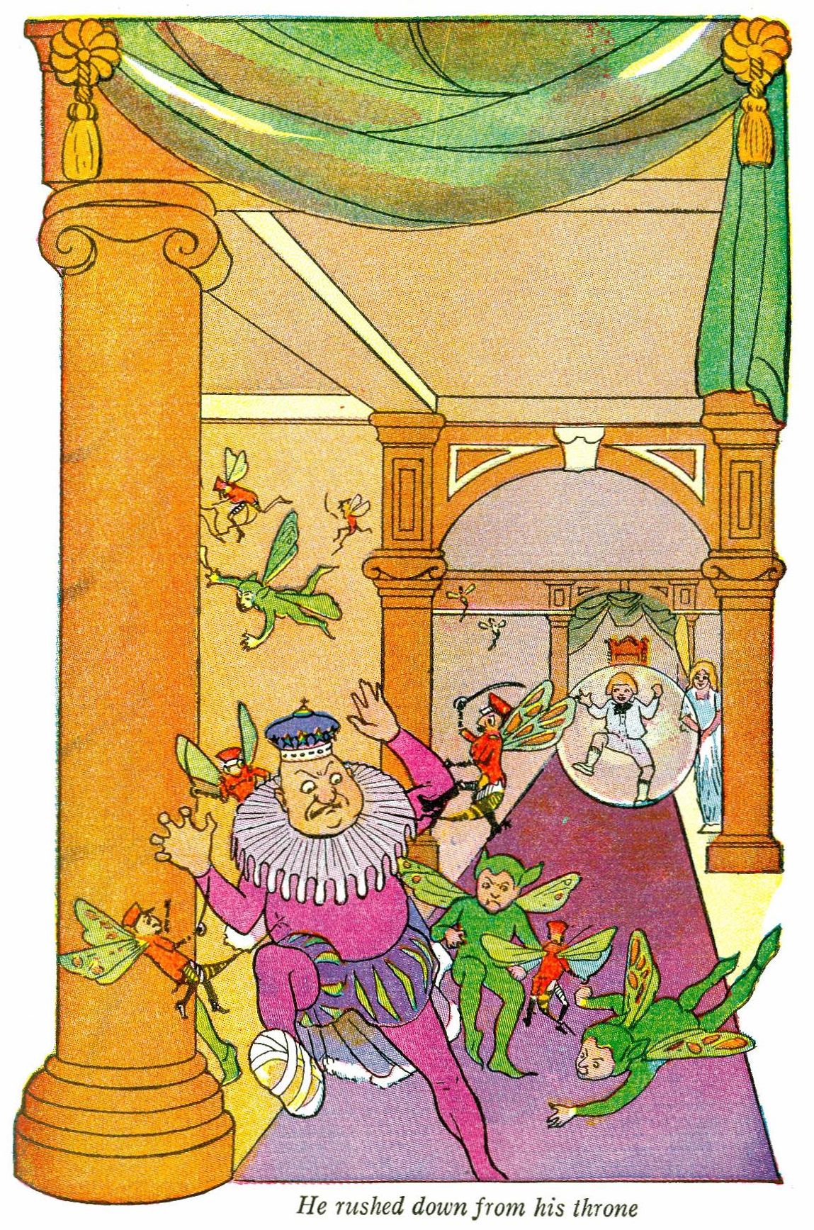 At the same time the bubble began to rise. As it floated through the window Bobbie could see the king and his men tearing madly round and round the palace yard. My! how angry they were, and how their arms and legs did smart where the soldiers had stabbed them!