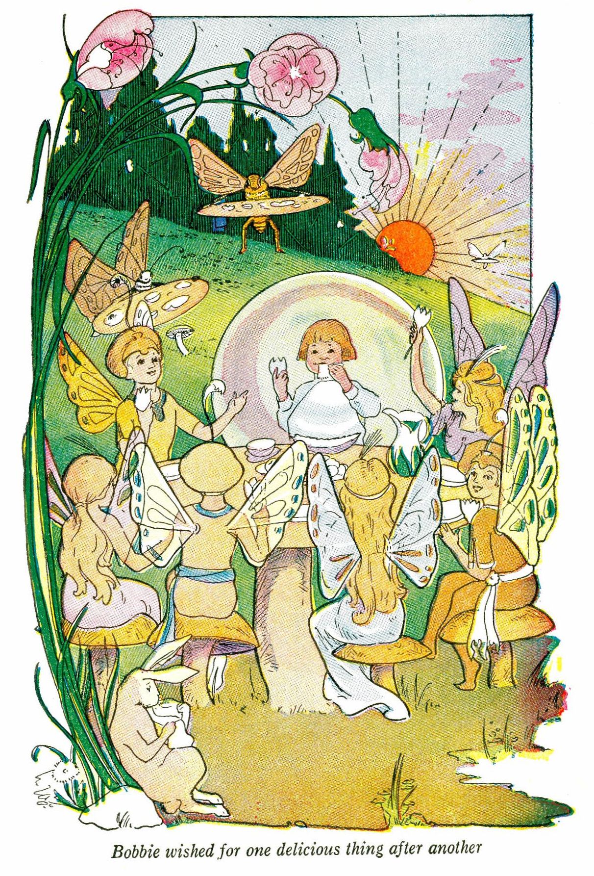 Half flying, half dancing, they circled round Bobbie and his fairy and led them to a tiny bower overhung with vines. In the center stood a great toadstool that served as a table, and around it smaller toadstool chairs. Upon the table was spread a wondrous banquet. There was honey in dainty flower cups, and the most delicious-looking food that Bobbie had ever seen. Gay-winged butterflies with lily-pad trays and little butler bees in smart striped waistcoats hovered about to serve the banquet.