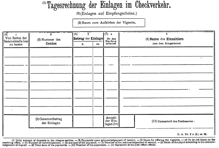 Each depositor will receive from the receiving office (Post office) where he pays in his first deposit, a deposit book in which each amount paid in, each amount paid back, and the interest added to the capital is to be entered. Each subsequent payment can be made at any receiving office (Post office), the amount being entered in the deposit book.
