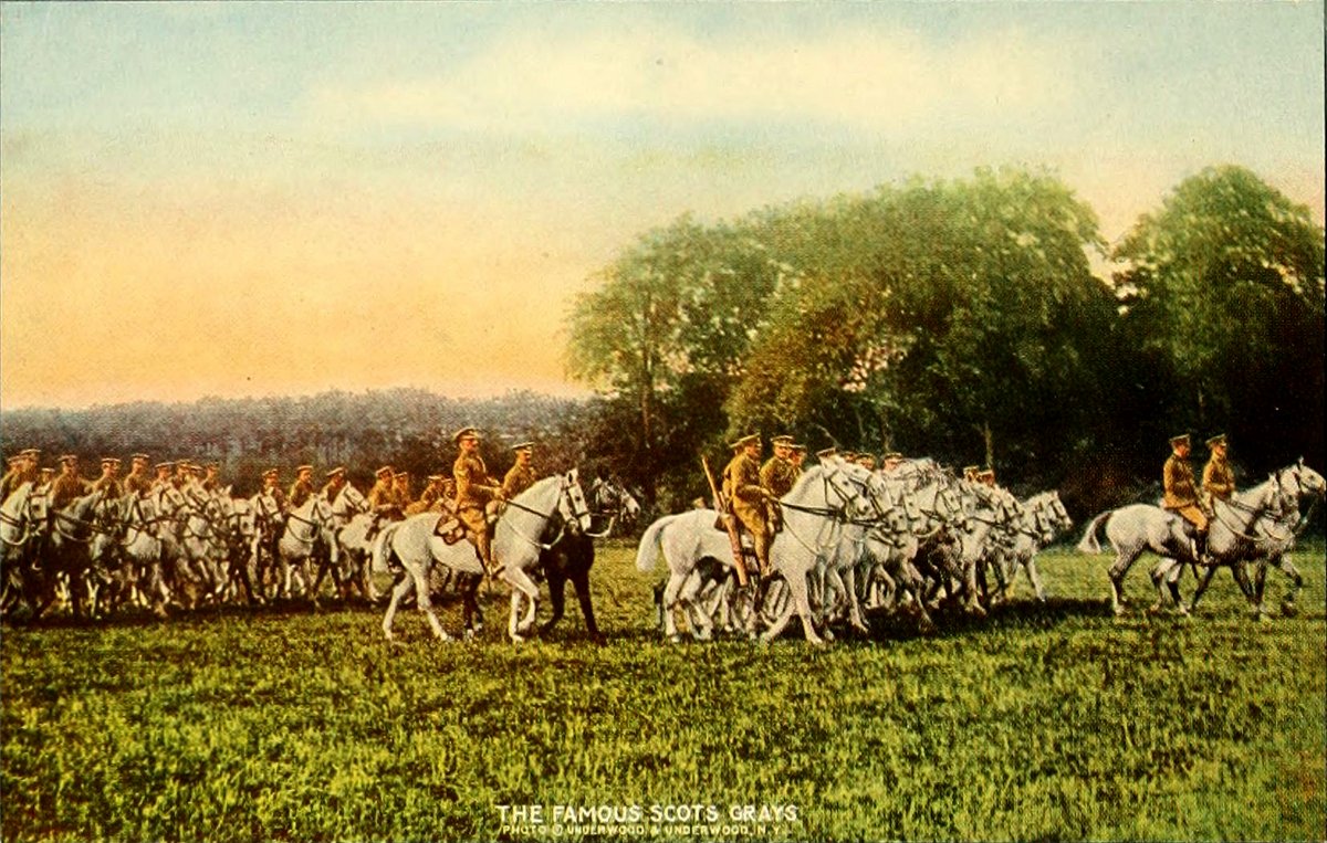 The Royal Scots Greys were the first regiment of dragoons raised in Great Britain (1681). There are now half a score of dragoon guard and dragoon regiments, all mounted and equipped as medium heavy cavalry. They are armed with carbine and sabre, and wear metal helmets (except the Scots Greys). This noted regiment has served with distinction in all parts of the world, and has already counted big in the British defense in France and Belgium. The "Grey" does not refer to the uniform, but to the horses, which all have their tails trimmed half-short.