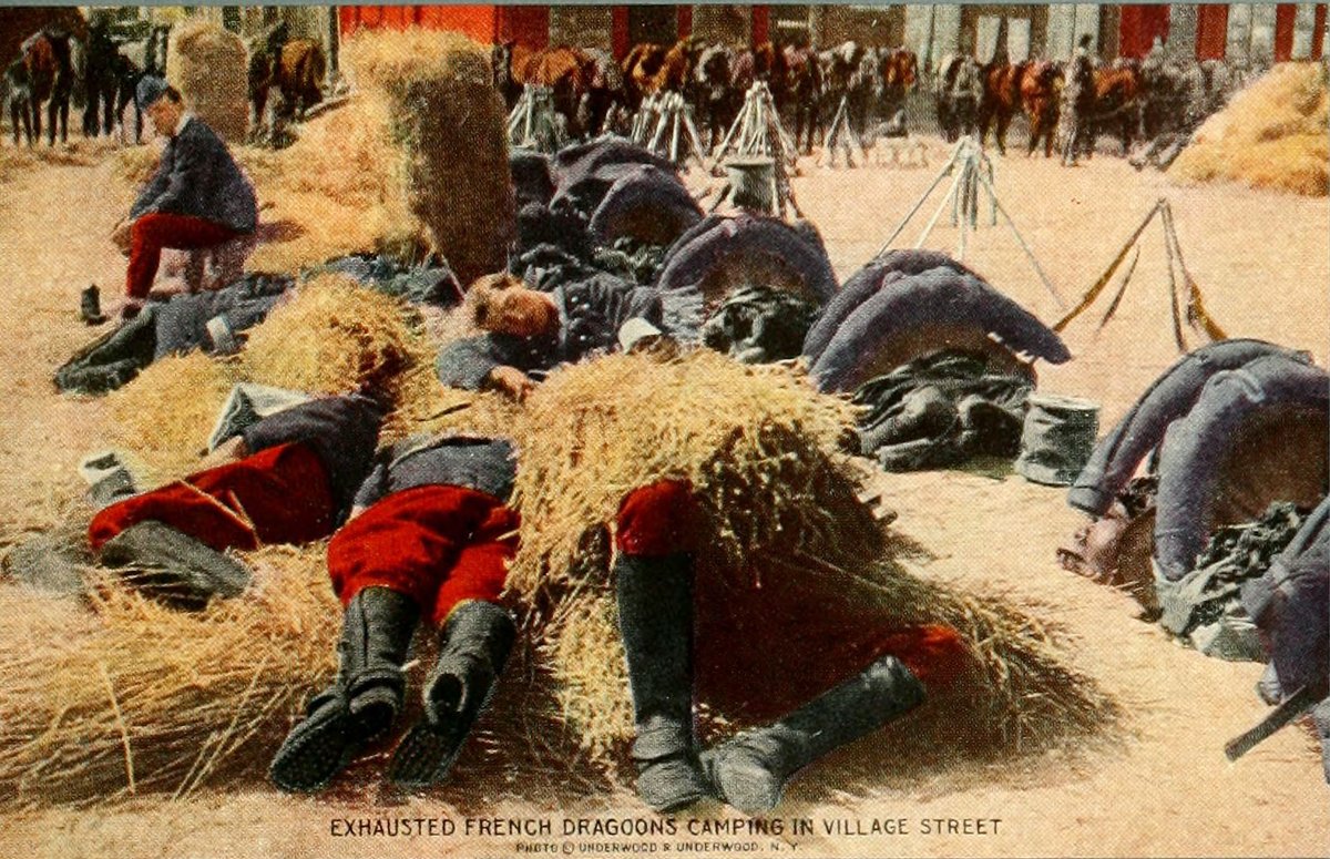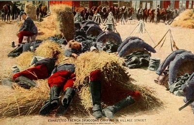 Dragoons were originally trained to fight either on horseback or afoot. Many of them carry bamboo lances, said to be even stronger than steel. The term "dragoon" probably comes from the dragon worked on the muzzle of the old carbine they used to carry, as dragons were supposed to spout fire. The bivouac on piles of straw, with weapons stacked ready for instant service, suggests vividly the condition of soldiers in the intervals of hard fighting. This is an actual scene on the line of retreat toward Paris.