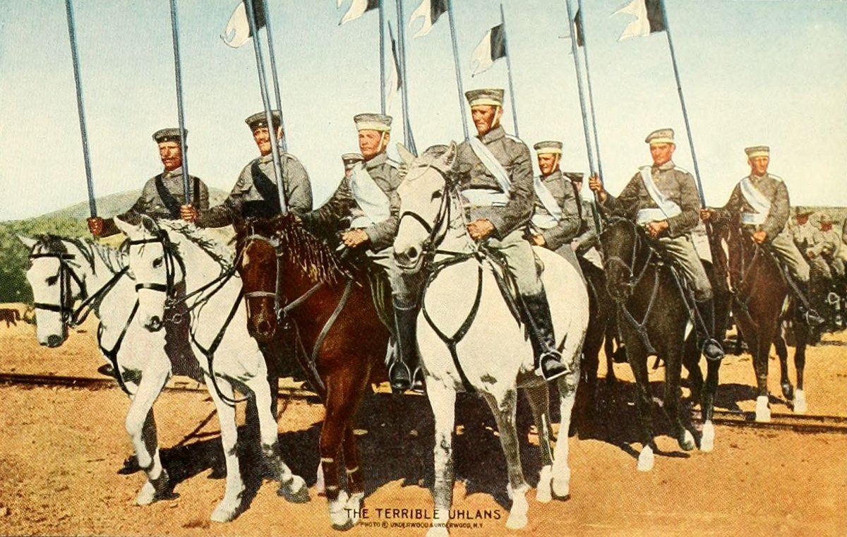 This variety of light cavalry was introduced into central Europe by the Tartars of Asia in the middle ages. They were armed with sabre, pistol and lance, at first carried in the left hand. The pennon is intended to frighten the enemy's horses, and identifies the men as Prussians. The Poles, Austrians, and Russians also adopted uhlans. In the Franco-Prussian War of 1870 they led the invasion of northern France, and won great fame by their fearless activity.