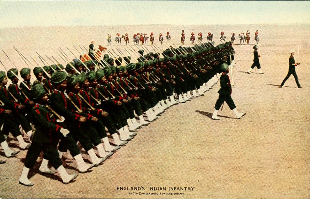 Here is the pride of India's contingent, 70,000 native troops—Sikhs and Ghurkas from the Himalayas, Bengal lancers from the Ganges, and Mahrata infantrymen from the torrid central plains. They wear their turbans even in Europe, where the remainder of the uniform is khaki.