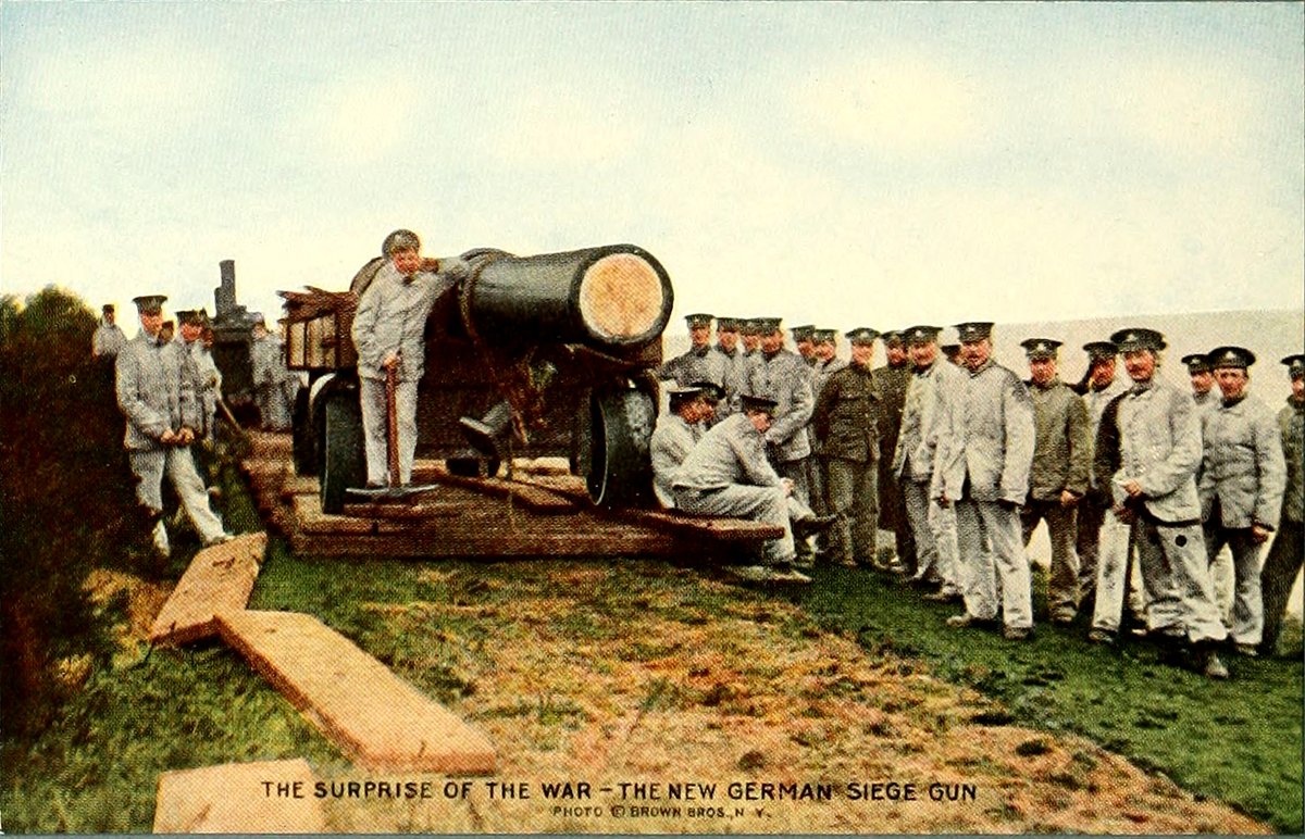 These are the guns that battered Namur into ruins, reduced Meubeuge, and were employed in the capture of Antwerp. The Germans demonstrated their marvelous efficiency in the "art of war" by keeping the existence of these fort-destroyers a complete secret until they were ready to use them against Belgium and France.