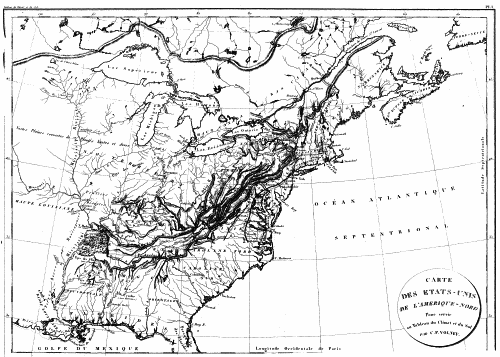 Les États contenus dans le bassin de Mississipi sont, la Géorgie occidentale, le Tennessee, le Kentucki, le grand district Nord-d’Ohio, appelé Northwest-territory, et quelques portions occidentales des États de Virginie, de Pensylvanie et de New-York. Les habitants de la côte atlantique donnent à toute cette partie le nom de Back-Country (Pays de derrière), indiquant par-là leur attitude morale, constamment tournée vers l’Europe, berceau et foyer de leurs intérêts et de leurs pensées: par un cas singulier et cependant naturel, à peine eus-je traversé les Alleghanys, que j’entendis les riverains du grand Kanhawa[23] et de l’Ohio, appeler aussi la côte atlantique Back-Country (Pays de derrière); ce qui prouve que déja leur situation géographique a donné à leurs regards et à leurs intérêts une direction nouvelle, conforme à celle des eaux qui leur servent de routes et de portes vers le golfe mexicain, foyer principal de l’ambition spéculative de tous les Américains.{20}