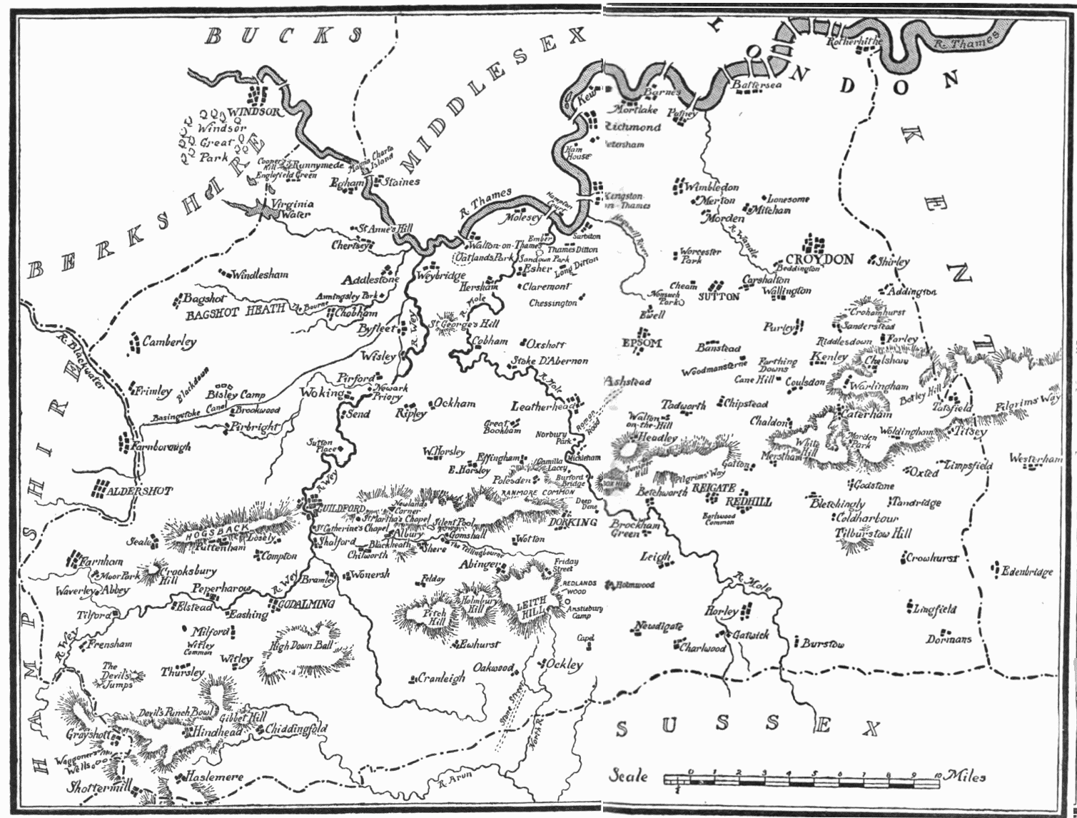 SURREY is but a small county, the latitudes or longitudes of which a good walker could traverse in a day; but perhaps no other in England can be found so close packed with scenes of manifold beauty. Among the “Home Counties,” at least, it seems best to answer Mr. P. G. Hamerton’s criterion of a perfect country as “one which, in a day’s drive, or half a day’s, gives you an entirely new horizon, so that you may feel in a different region, and have all the refreshment of a total change of scene within a few miles of your own house.” Its over-the-way neighbour Middlesex, which Cobbett, in his slap-dash style, puts down as all ugly, is at least comparatively tame and monotonous; and one must go as far as Derby or Devon for such boldly “accidented” heights{2} as those from which Surrey looks over the growth of London.