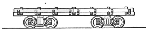 The first machines built were of the second type. As now constructed they are mounted on a wide wooden frame or car body, supported by four small wheels of 7 ft. to 8 ft. gage, thus placing the machinery close to the ground, with a wide base of support. In transporting this machine from one place to another, not on the line of a railway, it is necessary to take it apart, forward the sections and put them together again at the site of the new work. The machine is built with a view to rapid dismantling and re-erection, and for work requiring a large machine for economical excavation, located in hilly country not yet made accessible by rail, or requiring transportation by boat, it is the machine most generally used. Its ready adaptability to all kinds of work in any location has made it the favorite machine with many general contractors whose work includes large contracts for railway and other excavation. For transportation by rail this machine is run onto an ordinary flat car, only the crane being detached and loaded on a separate car. With this manner of shipment the machine can be made ready for railway work very quickly, but for exclusive railway work[5] a machine of a later design has come into use and is now generally preferred for this class of work.