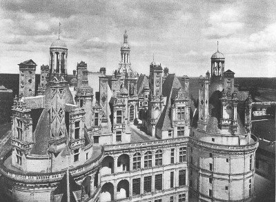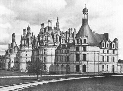 "Chambord is, indeed, throughout truly typical of the earlier stage of the new Renaissance movement. In the general arrangement, in the ordonnance, late Gothic caprice and fantastic love of the unforeseen rule triumphant. The older portions of the Château, the seemingly irregular assemblages of half Oriental turrets and spires, are debased Gothic, full of audacious disregard of all outward seeming of order. The architect, instead of seeking to bring home to the eye the general law, the plan on which the whole is grouped, has wilfully obscured and concealed it beneath the obviousness of the wild and daring conceits heaped above.