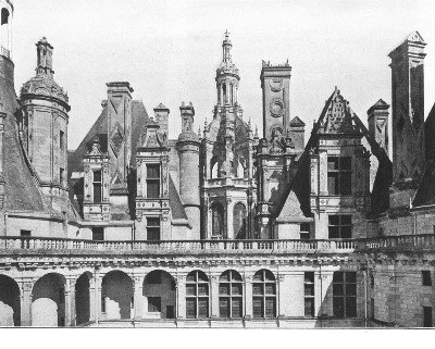The interior of the palace is now but a great wilderness of hewn stone. The sixteenth century treasures of art which had adorned it were all stolen or destroyed in the Revolution, the spoliation being so complete that it was stripped of even the carved wainscots, panels, doors and shutters, and the four hundred and forty enormous apartments now give only the impression of a vast and comfortless barrack. In the original arrangement of the interior all ideas of practical defense were sacrificed to produce a pleasure palace, and it was furnished with innumerable secret stairways (there are thirteen great staircases, not to mention numberless smaller ones) isolated turrets and a hundred facilities for what the gallant Viollet le Duc calls "les intrigues secrètes de cette cour jeune et tout occupée de galanteries."