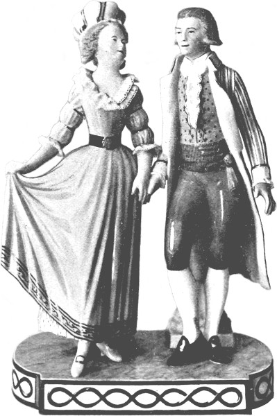 The story of the Swineherd provides another subject, and what grace and elegance and beauty are in the lines, and delicacy in the sentiment. It is an idyll in porcelain. Away with pierrots and mimes, the fevered extravagances of imagination[Pg 287] run riot in bizarre form and garish colour! Such a group as this should have a niche to itself in the china cabinet. It is superlatively chaste and reticent, daintily conceived and faultless in technique. The story is of the prince who became swineherd to the father of the weary princess. His taste for music took a mechanical turn in the whimsical invention of a pot that played tunes when it boiled, and, among other like toys, a rattle that would play waltzes and polkas. His hobby gained the fancy of the princess, who had to buy them with kisses. The porcelain represents the completion of the fairy-tale bargain. Alas! there is no happy ending, for the kissing became so fast and furious that the swineherd threw off his disguise, became prince on a sudden, and departed home to his kingdom, in disgust with a princess who could look with disdain on his presents of a rose and a nightingale because they were only natural, and set her affections on the trivialities of a swineherd.