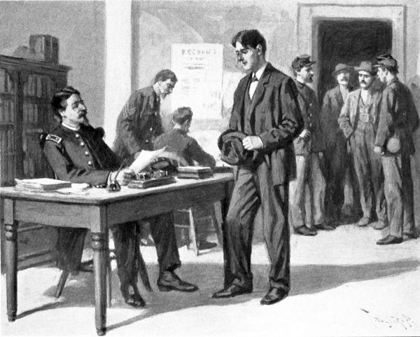 The sergeant, turning appealingly to the captain, who was standing with folded arms at some little distance, said deprecatingly: “It’s none o’ my business. All I got to do is to call the roll. I don’t muster ’em in.”