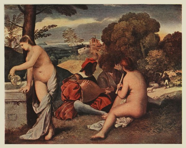 «Au milieu d’un de ces paysages d’une richesse de ton étouffée et chaude dont Titien s’est souvenu plus d’une fois, de jeunes seigneurs font de la musique: l’un joue du luth et l’autre semble l’écouter. Au premier plan, une jeune femme nue, vue de dos, et assise sur un épais gazon d’un vert doré, approche de ses lèvres une flûte. A la gauche, une autre jeune femme, qui n’a d’autre vêtement qu’un bout de draperie blanche glissant de la hanche sur la cuisse, s’appuie sur le bord d’une espèce d’auge en marbre et y plonge, pour l’emplir, une bouteille de verre. Les deux jeunes seigneurs ont d’élégants costumes vénitiens dans le goût de ceux de Vittore Carpaccio; ils ne semblent nullement se préoccuper du contraste que présentent leurs riches habits avec la nudité de leurs compagnes. Le peintre, dans cette suprême indifférence artistique qui ne songe qu’à la beauté, n’a vu là qu’une heureuse opposition de belles étoffes et de belles chairs, et en effet il n’y a que cela. Le torse de la femme penchée sur la vasque, le dos de celle qui joue de la flûte, sont deux morceaux de peinture magnifiques. Jamais coloris plus blond, plus chaud, plus moelleux et d’une consistance plus riche ne revêtit d’opulentes formes féminines.