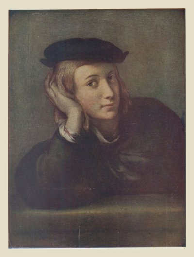 D’autres affirment avec moins d’énergie que ce portrait n’est pas 272 l’œuvre de Raphaël, mais celle d’un certain Francesco Ubertini, surnommé Bacchiacca. Comme rien ne démontre ce dire et que d’ailleurs la toile en cause est un chef-d’œuvre, comme d’autre part, l’insinuation est toute récente, rien n’oblige à l’accepter; tout, au contraire, invite à l’attribuer à Raphaël plutôt qu’à un inconnu. Au surplus tout, dans cette toile, trahit la main de Raphaël; c’est la même technique que l’on retrouve dans son propre portrait du musée des Offices; c’est celle de tous ses autres portraits, avec la même grâce, la même onctueuse habileté, les mêmes clartés de palette.