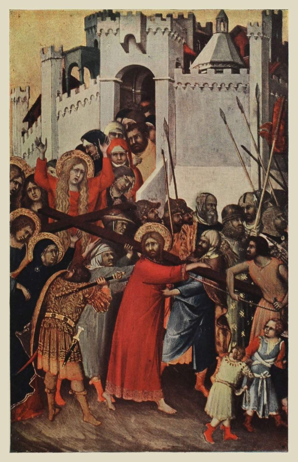 Le Christ, vêtu d’une robe rouge, porte sa croix et s’avance vers la droite, entraîné par les bourreaux. Son corps est légèrement incliné, et sa tête se retourne à demi vers un soldat qui, derrière lui, écarte la Vierge et les saintes Femmes. Au fond, la Madeleine, vêtue d’une robe rouge, se dresse en gémissant, les cheveux épars. Elle est suivie d’une foule qui traverse un pont. A l’horizon, se profilent les remparts d’une ville.