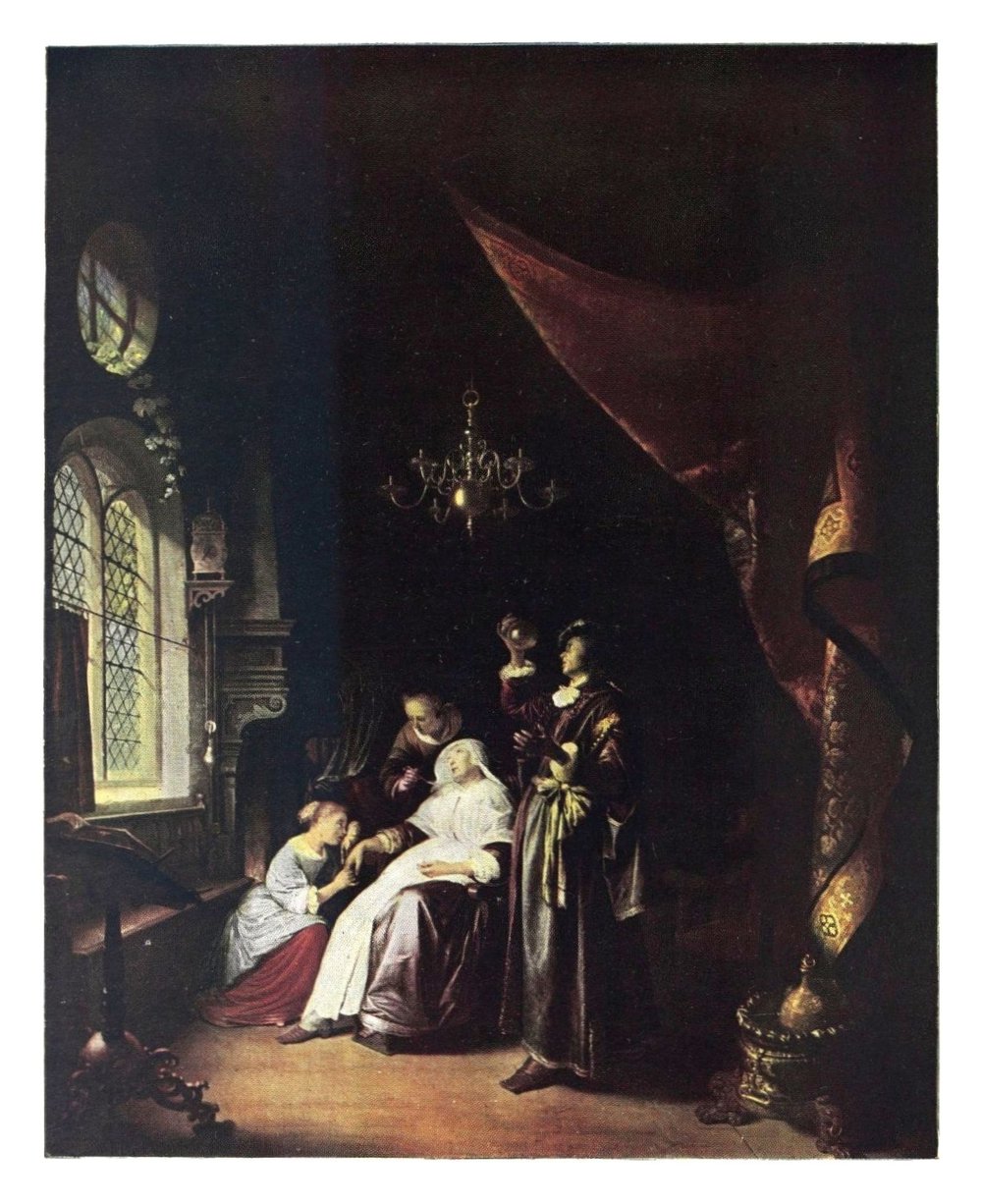 INTÉRIEUR de riches bourgeois hollandais. Dans un fauteuil est assise une femme dont le visage exprime la souffrance. Agenouillée près d’elle et lui tenant la main, sa fille la regarde en pleurant. Derrière le siège une servante est penchée sur la malade et lui tend une cuiller contenant un remède. Au premier plan, debout, un médecin présente à la lumière de la fenêtre un flacon dont il examine attentivement le contenu.