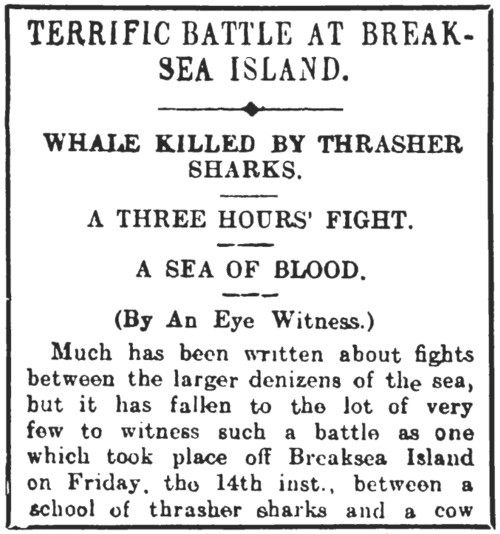 Much has been written about fights between the larger denizens of the sea, but it has fallen to the lot of very few to witness such a battle as one which took place off Breaksea Island on Friday, the 14th inst., between a school of thrasher sharks and a cow