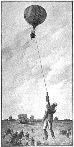 The balloon, relieved of the heavy load, at once shot up again. There were wild cries of “Seize the rope!” “Hang on to her!” “Hold her down!” But all the shouts were of no avail; the balloon continued to rush upwards, while we peered helplessly over the edge of the car. Several men, realizing the dangerous position we were in, soaring up aloft at great speed, rushed into the middle of the crowd of excited onlookers and seized the trailing rope, but all to no purpose; it was now impossible to check the balloon’s rapid ascent. “Let go!” roared somebody, and by the sudden bound our car gave we knew the men had obeyed. All, that is, save one. He, Tickner, a hard-working, much-respected farm labourer, clung to the rope like a monkey, only to be drawn up into the air as the balloon rose. Higher and higher we went, with the hapless man 427 dangling two hundred feet below us and the crowd watching with horror in their eyes. Presently, when he was about eighty feet from the earth, the poor fellow’s strength gave out and he was compelled to let go, falling with an awful thud to the ground.
